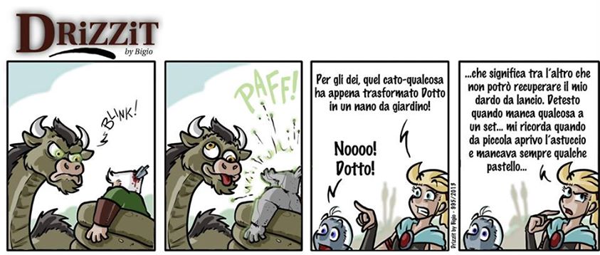 Bigio ci è riuscito, e con una cosa semplice ma fondamentale: la costanza. Le strisce di Drizzit, infatti, escono una volta al giorno dal lunedì al sabato, senza sgarrare nemmeno una volta sulla tabella di marcia. Questo fa in modo che un enorme numero di gente passi a controllare la pagina e legga la striscia, che diventa anche una sorta di ‘appuntamento quotidiano’. Ed è un appuntamento che ho preso anche io, nonostante Drizzit non mi entusiasmi più di troppo: prova che l’autore ci sa fare, ed ha colto nel segno per quel che riguarda il modo di proporre la sua opera.