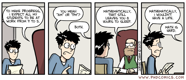 PHD Comics è una creatura di Jorge Cham, che ne scrive sia testi che disegni dal lontano 1997. Nasce, in verità, come una creatura ibrida, essendo pubblicato oltre che sulla Rete anche su alcuni giornali come lo Stanford Daily. Ora, un fumetto pubblicato su un giornale vuol dire una cosa sola, una tipologia di narrativa disegnata nota come la strip: poche vignette (cinque al massimo, ma anche una sola), solitamente di stampo comico-umoristico. Non c’è una vera e propria storia, ma ambiente e personaggi rimangono sempre gli stessi.