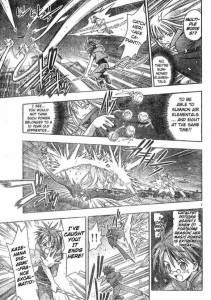 Lo stile dei combattimenti di Negima ricorda a momenti quelli di Dragon Ball, rispetto a quelli di qualunque altro manga, e si nota soprattutto dagli scontri centrali del manga che spesso diventano confronti diretti su quale sarà l’incantesimo più devastante; anche per le trasformazioni, e il modo di combattere che Negi adotta a un certo punto della serie, che ricorda stilisticamente quello adottato dal protagonista del manga di Toriyama, con variazioni dal punto di vista grafico ordinate secondo potenza (simile anche al modo di trasformarsi adottato dalla protagonista di Medaka Box) ma non vengono a mancare i contributi dei personaggi non combattenti, che con le loro azioni, più che rendere effettiva la vittoria di Negi sul campo, la rendono totale anche nelle circostanze, permettendo anche il raggiungimento di condizioni che non dipendono direttamente dall’esito di uno scontro, come salvare una compagna o degli innocenti prima di un disastro. Un altro degli aspetti che più mi ha affascinato nel manga è il continuo riferimento ad alcuni aspetti del mondo videoludico, e in particolare ai giochi di ruolo in stile giapponese: molte delle discussioni, fatte nelle sessioni di allenamento (che non possono mancare mai, spesso condotte in una specie di Stanza dello Spirito e del Tempo versione Casa delle Bambole) del protagonista e dai vari maestri che incontra nel corso della serie, mi sembrano le stesse che facevo io quando studiavo strategie di gruppo per Final Fantasy Tactics o Tactics Ogre (e non troppo dissimili a quelle che si possono sentire a un tavolo dove delle persone giocano a Dungeons&Dragons). I power-up in Negima, infine sono molteplici, ma quasi tutti concentrati nella seconda parte del manga in cui il protagonista diventa più forte grazie all’ampliamento dei suoi orizzonti e la conoscenza di arti magiche più sofisticate, che diventa in grado di padroneggiare soprattutto grazie al continuo studio delle basi nella prima parte, quando la sua maestra è Evangeline (personaggio chiave non solo in Negima, ma anche in UQ Holder). Il personaggio di Asuna, per fare un altro esempio, sviluppa della capacità che sembrano prese dal mondo dei picchiaduro, a colpo d’occhio direi Street Fighters e Soul Calibur.
