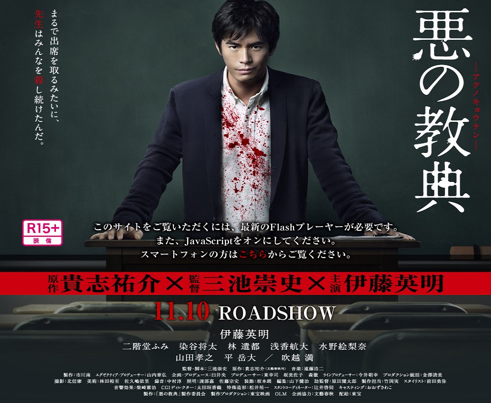 Kishi Tusuke è il creatore del romanzo Aku no Kyoten, anche conosciuto come Lesson of the Evil. E’ stato rilasciato da poco il full trailer che vede quest’opera adattata su base film live-action. Il regista è Takashi Miike, che si è occupato di molte altre live-action come Juusan-nin no shikaku / 13 nin no Shikaku (13 Assassins), Time Bokan Series: Yatterman – The Movie (Yatterman – The Movie) e Crows: Episode 0 (Crows Zero). La data di uscita del lungometraggio in Giappone è prevista per il 10 novembre di quest’anno e sarà vietato ai minori di 15 anni.