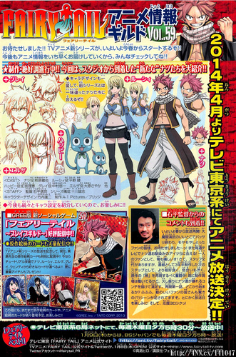 Hiro Mashima mantiene sempre le promesse… dopo mesi di tweet e richieste di pazienza, finalmente l’annuncio ufficiale, nella sesta uscita del 2014 di Weekly Shonen Magazine della Kodansha: questo Aprile tornerà l’anime di Fairy Tail, con episodi nuovi ma qualche cambiamento nello staff di produzione. La Satelight infatti abbandona lo studio A-1 Pictures come supporto all’animazione e viene sostituito dallo studio Bridge (non so dirvi se sia un bene o un male) e Shinji Takeuchi sostituisce Aoi Yamamoto al character design (Takeuchi ha già ricoperto questo ruolo in Gintama). Il regista Shinji Ishihira si è dichiarato felicissimo di poter riprendere i lavori su questa serie, e ha promesso un aumento in tutti gli aspetti della qualità dell’anime (non vogliatemene, lo dicono sempre ndRegola). Lo staff dei doppiatori rimane invariato: