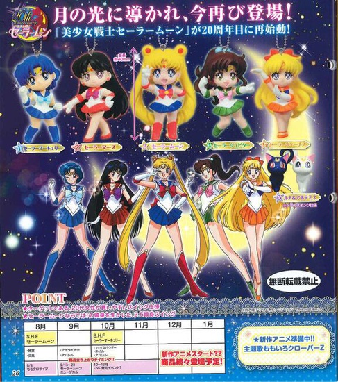 Su un volantino che pubblicizza la prossima messa in vendita di portachiavi in super-deformed di Sailor Moon, realizzati appositamente per ragazze intorno ai vent’anni, è stato pubblicato l’elenco completo di tutto il merchandise legato alla serie che uscirà nel corso dei prossimi mesi, inclusi alcuni oggetti che non erano ancora stati annunciati. La nuova ondata di merchandise di Sailor Moon è stata creata in previsione della nuova serie animata ispirata all’omonimo manga di Naoko Takeuchi.