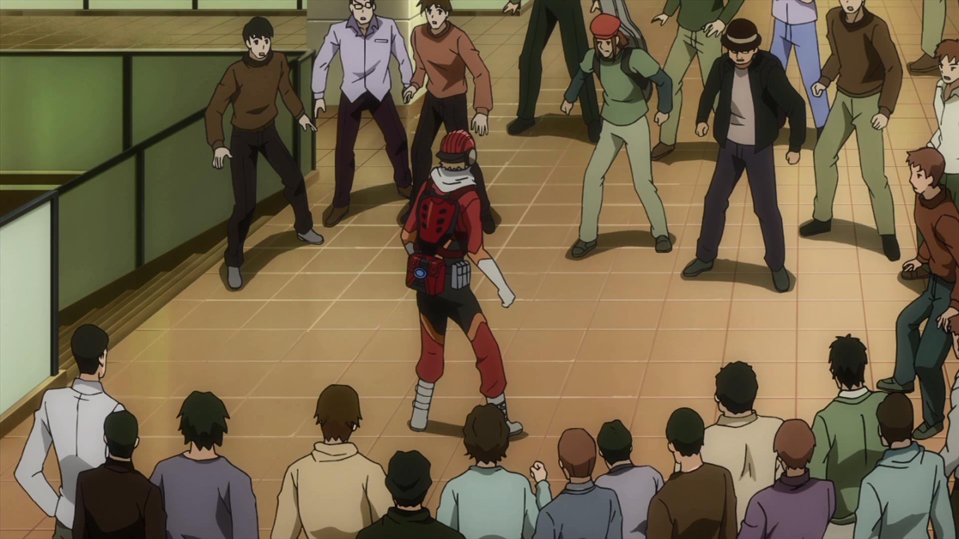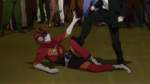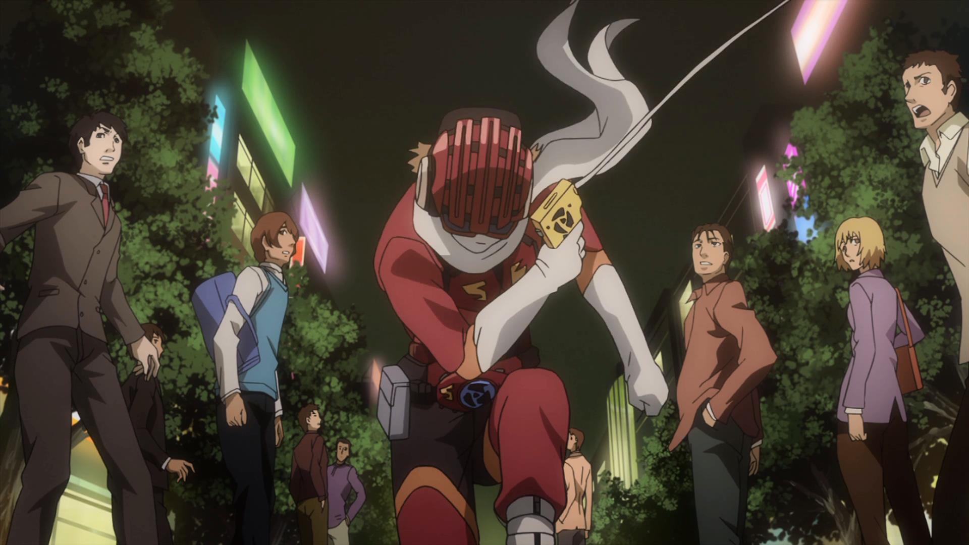 Tra svariati riferimenti omosessuali (ambi i lati) piazzati di tanto in tanto, umorismo altalenante, lentamente Samurai Flamenco svela quelle che sono le sue carte vincenti, presentandosi come una perfetta rappresentazione in tempi moderni di quello che è il concetto di super-eroismo, delle origini e degli sviluppi di questo tipo di personaggio, mettendo in scena un piccolo paradosso: vediamo trasportati tutti questi elementi “fantasiosi” nella realtà attraverso uno strumento della fantasia, come un anime. Samurai Flamenco è una rapida e concentratissima escalation di eventi sempre tendenti all’assurdo, che attirano soprattutto per il potere di coinvolgere lo spettatore nella più assoluta incredulità. Eppure guardando Samurai Flamenco mi sono improvvisamente ricordato di un altro fumetto a tema super-eroistico, di genere tuttavia molto diverso: Il Ritorno del Cavaliere Oscuro di Frank Miller. È in questo lavoro, probabilmente il più noto di quest’autore, che trova perfetta raffigurazione una delle dinamiche del super-eroismo più nascoste, a volte determinante; come Miller ci insegna, non sono i buoni a comparire per fermare i cattivi, sono bensì i cattivi a rispondere alla chiamata dell’eroe, poichè solo nella coesistenza entrambi hanno ruolo. Appare ovvio, pertanto, che qualcuno rispondesse al richiamo di Samurai Flamenco, perchè Masayoshi stesso necessita di una controparte puramente malvagia per contrastare il suo (ingenuo) essere puramente buono.