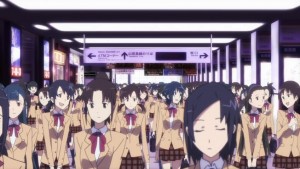 La trama: l’accademia Osai, rinomato istituto esclusivamente femminile apre i battenti anche agli esseri viventi di sesso maschile diventando mista, ed è per questo che Tsuda, abitandovi vicino, vi si iscrive risultando essere uno dei 28 maschi contro le 524 ragazze. Ed è l’unico maschio che non si è iscritto alla Osai con l’intento di crearsi un proprio harem personale… questa storia sa di vecchio, ma siccome la trama di Yakuindomo è pressochè inesistente chiuderò un occhio. Il primo giorno di scuola ci viene mostrato quanto possa essere difficile per i maschi vivere in tale inferiorità numerica (rispetto a un’interminabile popolazione femminile) attraverso una cinematica di pochi secondi degna del miglior regista horror…credo che per i giapponesi l’associazione harem/paradiso sia legata anche alle affinità tra inferno/paradiso, altrimenti tanti conti non mi tornano. All’ingresso Tsuda fa la conoscenza Shino Amakusa, presidentessa del Consiglio Studentesco (Seitokai, per l’appunto) che emana un’aura di serietà e rispettabilità, ed è in effetti ammirata da tutto il corpo studentesco; Shino è preoccupata per l’integrazione dei ragazzi iscrittisi al primo anno, e costringe pertanto Tsuda a diventare suo vicepresidente, in modo che i maschi abbiano voce in capitolo nelle questioni che determinano la nuova convivenza. Insieme a Shino conosce anche Aria Shichijo, la classica bellezza un pò svampita figlia di ricchi industriali che ricopre il ruolo di segretaria, e la tesoriera Suzu Hagimura, tanto intelligente quanto di bassa statura…tanto bassa che non entra nelle inquadrature e la sua posizione viene pertanto indicata da una freccia.