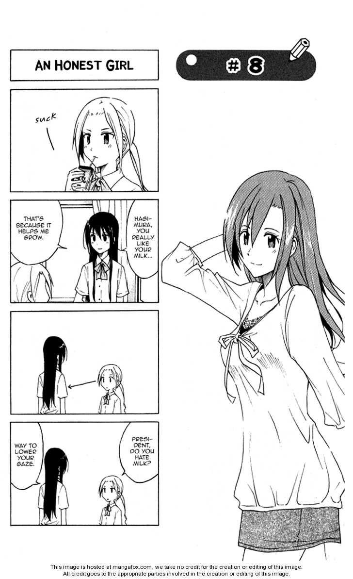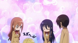 Probabilmente sto esagerando, qualche battuta o situazione senza doppi sensi c’è, seppur molto rara e annegata in quello che è il tema ricorrente delle discussioni dei vari personaggi che si avvicendano. Questi rari momenti sono quelli che forse condividono Tsuda e Suzu, le due uniche “persone normali” della serie, e alcune delle interazioni tra Tsuda e Mutsumi, fondatrice del club di judo, che merita un discorso a parte: questa è una ragazza semplice e ingenua, genuinamente interessata a Tsuda che pertanto non capisce i continui commenti e doppi sensi operati da Shino, Aria e altri personaggi; inoltre, essendo la sua una passione legata a uno sport come il judo, potete immaginare quali e quanti commenti si possano fare a riguardo. La presenza di Tsuda è necessaria per la funzione di molte battute e molte gag, poichè queste si strutturano molto spesso nella struttura del Manzai: si tratta di una forma di commedia tipica giapponese che prevede l’interazioni di due personaggi, uno serio (tsukkomi) e uno invece che prende le parti del buffone (boke). Tsuda ovviamente prende il ruolo di tsukkomi, che cerca sempre di riportare alla realtà, come meglio può, i vari personaggi femminili che compaiono sottolineando le loro battute con commenti a volte anche sarcastici. Credo sia questa la sostanziale differenza tra Yakuidomo e Ichizon (che citavo sopra): mentre Tsuda è utilizzato per completare la scena, il protagonista di Ichizon, Sugisaki Ken, crea la scena diventando spesso il regista delle situazioni e delle interazioni con i vari personaggi.