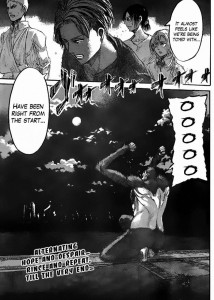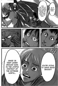 Detto questo, passiamo all’analisi dei capitoli 35-50, perchè in soli sedici capitoli è stata messa talmente tanta carne al fuoco che quasi mi dispiace affrontare l’analisi in una sola parte, e in modo così sintetico. Dopo l’avvenuta cattura e la cristallizzazione di Annie, infatti, i protagonisti di questa storia non hanno avuto un attimo di pace, come se il fato stesso volesse impedire ad Eren di arrivare alle rovine di casa sua e scoprire cosa ha lasciato il padre nello scantinato.