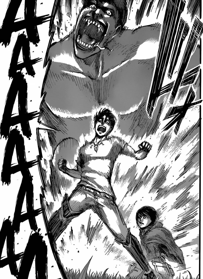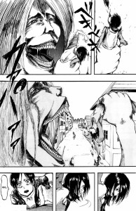 Per quanto riguarda la mia ipotesi sulla nascita dei Giganti, credo che per ora mi venga di dare più credito alla teoria immunologica: è come se a un certo punto della storia del genere umano si sia sparso questo “virus” (anche metaforicamente parlando) che ha trasformato gran parte della popolazione mondiale in Giganti. Questo fatto comunque, è ancora da accertare, poichè si potrebbe scoprire di punto in bianco che i Giganti “selvaggi”, i “non-risvegliati” non siano tutti umani (anche se mi parrebbe strano allo stato attuale delle cose). A un certo punto, tuttavia, è possibile che gli organismi umani abbiano sviluppato degli anticorpi, e acquisito quindi la capacità di controllare il proprio corpo “mutato”: fondamentale per quest’ipotesi è scoprire cosa il padre di Eren gli abbia iniettato quando era ancora giovane. Altra ipotesi che in certi momenti vorrei abbracciare, è quella parassitaria, di organismi che hanno alterato la struttura fisica (soprattutto cerebrale) del genere umano fino alla comparsa sempre di individui che sono riusciti a sviluppare un certo controllo su di questi. Ma come si sviluppi questa capacità, come gli umani in grado di diventare Giganti si “risvegliano” non è ancora chiaro, e il caso di Eren è talmente particolare da non essere utilizzabile come esempio.