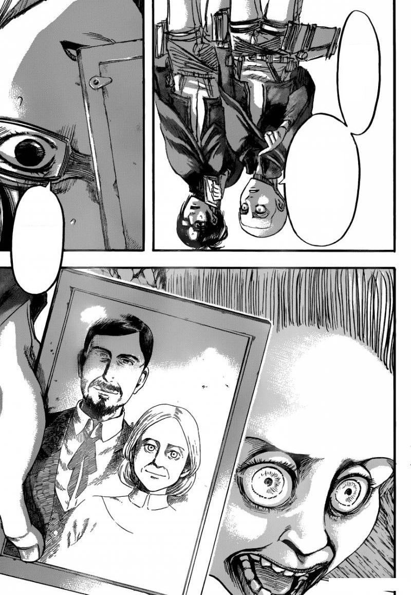Punto secondo. Sebbene si sia dimostrato inutile, e a tratti impossibile prevedere le scelte in fatto di trama e sviluppi di Isayama, è oramai chiaro a tutti che ogni piccolo dettaglio che aggiunge alla storia ha una sua funzione, una ragion d’essere. Evidenzierei attentamente la questione dei rifugiati, tutte quelle persone che in seguito all’attacco all’interno della seconda cinta muraria hanno trovato temporaneo rifugio sottoterra: la situazione con queste persone, dopo una settimana, è alquanto delicata e non sono mancati episodi di disagio e violenza, nonostante l’ordine di pericolo sia rientrato. Probabilmente Isayama vuole dirci che se la seconda cinta muraria venisse persa, sarebbe impossibile contenere tutta la popolazione insieme ai rifugiati nella prima cinta muraria. Nel frattempo i personaggi hanno riordinato le idee, e Levi ha ben pensato di rimettere su una squadra per difendere Eren (e Historia) e spostare tutto il 104esimo scaglione sulle montagne, nell’ottica di avviare queste benedette preparazioni per arrivare a quel maledetto scantinato dove si nasconderebbe qualche importantissima verità… non posso fare a meno di pensare, tuttavia, che potrebbe essere qualcosa non tanto di inaspettato, quanto di “inutilizzabile“. Eren, sebbene ancora confuso per il miracolo che ha salvato lui e i suoi pochi compagni rimasti nel precedente capitolo, inizia anche a intravedere una possibilità in questa lotta disperata, ma il peso delle persone morte per proteggerlo e salvarlo dai suoi rapitori comincia a essere più di quanto potrebbe sostenere. Quello che è apparso strano, non solo al sottoscritto, ma a quanto pare a molti è stata infine la reazione di Jean nella parte iniziale del capitolo: è vero che le sue parole in qualche modo destano Eren, ma i tempi e i modi che ha scelto per esprimersi mi sono parsi strani, sebbene coerenti (odio questa parola, ma non ho un sinonimo migliore) con quello che è stato il personaggio fino a questo punto.