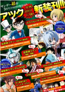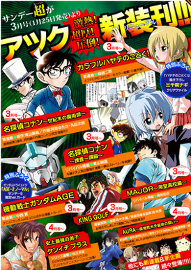 Tra i titoli annunciati ci sono di Colorful Hayate no Gotoku! (Colorful Hayate the Combat Butler) di Kenjiro Hata che avrà tra 4 e 6 vignette. Il manga originale di Hayate debuttò su Weekly Shonen Sunday (Shogakukan) nel 2004.Altro titolo è Meitantei Conan: Seiki matsu no majutsushi (Detective Conan: L’ultimo mago del secolo) di Yutaka Abe che sarà composto da tre capitoli e la sua pubblicazione avrà inizio nel numero di marzo. I capitoli saranno basati sulla storia originale scritta da Aoyama Gosho il film sul Detective Conan del 1999. Per il piccolo detective le novità però non sono finite, poiché sarà raccontato di nuovo da Aoyama il primo caso di Conan in Detective Conan: Sousa Ichi-ka Hen.Altro manga che debutterà in questo numero sarà quello ispirato alla serie animata di Mobile Suit Gundam AGE, sarà disegnato da Hiroshi Nakanishie dovrebbe ripercorrere la trama narrata nella serie anime.
