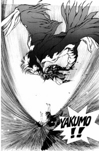 3×3 Occhi possiede anche elementi harem nella prima parte, in cui Yakumo attira l’attenzione di giovani ragazze a cui salva la vita nonostante i rischi per la propria persona (esistono molti modi per liberarsi di un immortale, soprattutto se questi è debole), ma questi elementi vengono meno con l’avanzare della storia che raggiunge la sua piena maturità con la quarta serie, detta Legend of Trinetra. Le prime tre serie (volumi 1-2, 3-5, 6-12) fungono da introduzione e preambolo per la vera battaglia che Yakumo, Pai e i loro compagni dovranno affrontare, in una spirale di eventi che avrà un’influenza planetaria… in modi che lo shonen classico difficilmente azzarderebbe. Inoltre, molti dei personaggi di questo manga sono esseri umani, ed è per loro impossibile o molto difficile affrontare gli svariati demoni che compaiono sporadicamente: al centro dell’azione c’è sempre Yakumo, e qualche volta anche la Triclope Pai quando riesce a sfruttare quegli immensi poteri che ogni creatura delle tenebre brama di possedere per sé. Figura centrale nei combattimenti è quasi sempre il protagonista, che per lottare sfrutta soprattutto quelle che vengono definite come larve, demoni inferiori in possesso di capacità spesso basilari che lo “stregone” può evocare dopo aver stretto un contratto di sangue, semplicemente donando loro la sua energia vitale. Non spirituale, ma vitale, tendo a sottolineare, l’energia in 3×3 Occhi può tranquillamente essere considerata di origine metabolica, tant’è che quando Yakumo la esaurisce viene privato anche delle funzioni deambulatorie più elementari (il suo vantaggio è quello di non morire per l’esaurimento delle scorte) e la sua rigenerazione, la caratteristica più ambita della posizione di Wu, viene anche compromessa e rallentata. (La rigenerazione dei Wu è una delle più potenti che abbia mai visto, essi impiegano all’incirca due settimane per rigenerarsi dopo essere stati completamente obliterati.)