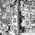 La ripetizione della dinamica tipicamente shonen, in cui il protagonista vince dopo aver subito o sofferto per tutto uno scontro, era ampiamente garantita ad ogni duello, e l’autore non aveva che da variare le mosse dei suoi personaggi o le combinazioni tra queste. Si tratta di un sistema che garantisce ampiamente la possibilità di tirare fuori svariati colpi di scena limitandosi a mantenere uno stile coerente nel tipo di azioni (leggi: carte giocate) dei personaggi, senza doversi preoccupare troppo di allenarli e farli crescere… è sufficiente, in pratica, aggiungere una carta alla loro lista. L’importante, come sempre, è quello di non perdere mai la fiducia in se stessi e credere sempre in quello che si fa, che sia una sfida a dadi o un gioco di carte. Yu-gi-oh! in qualche modo influenza il metalinguaggio shonen in modi che ancora mi sfuggono, proponendocelo in una poliedrica forma secondo la quale è possibile che i personaggi combattano e si sfidino in ogni ambiente, con ogni logica e strumento possibile. È solo l’inizio dell’epoca dei manga in cui tutto, anche “pescare una terra“, diventa maledettamente “figo“.