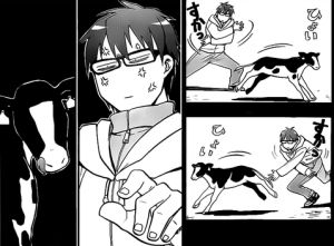 Continuando la lettura, più per provare a me stesso la validità delle mie intuizioni che per vero interesse, sono riuscito a superare anche il secondo ostacolo. Il mio timore, nella lettura di Silver Spoon era di leggere un manga che contenesse un messaggio animalista fuoriluogo: non vi è niente del genere. Gli animali vengono trattati come tali, non vengono “personificati” come accade con quelli domestici, e sebbene amati e rispettati dai loro proprietari il loro “destino” non cambia: pertanto le galline che non fanno più uova vengono uccise, i maialini più piccoli trasformati in pancetta, gli animali da lavoro che non possono più svolgere il loro lavoro abbattuti… una visione a volte crudele della realtà, eppure, allo stesso tempo realistica e non costellata da inutili sentimentalismi. Chiudendo il primo volume ho avuto come l’impressione che l’autrice volesse mandare un messaggio ai milioni di persone che leggono i suoi manga, soprattutto a quelli che, vivendo in metropoli spesso non realizzano cosa sia necessario fare (e soprattutto come farlo) per trasformare i prodotti naturali nel cibo che arriva in tavola ogni giorno.