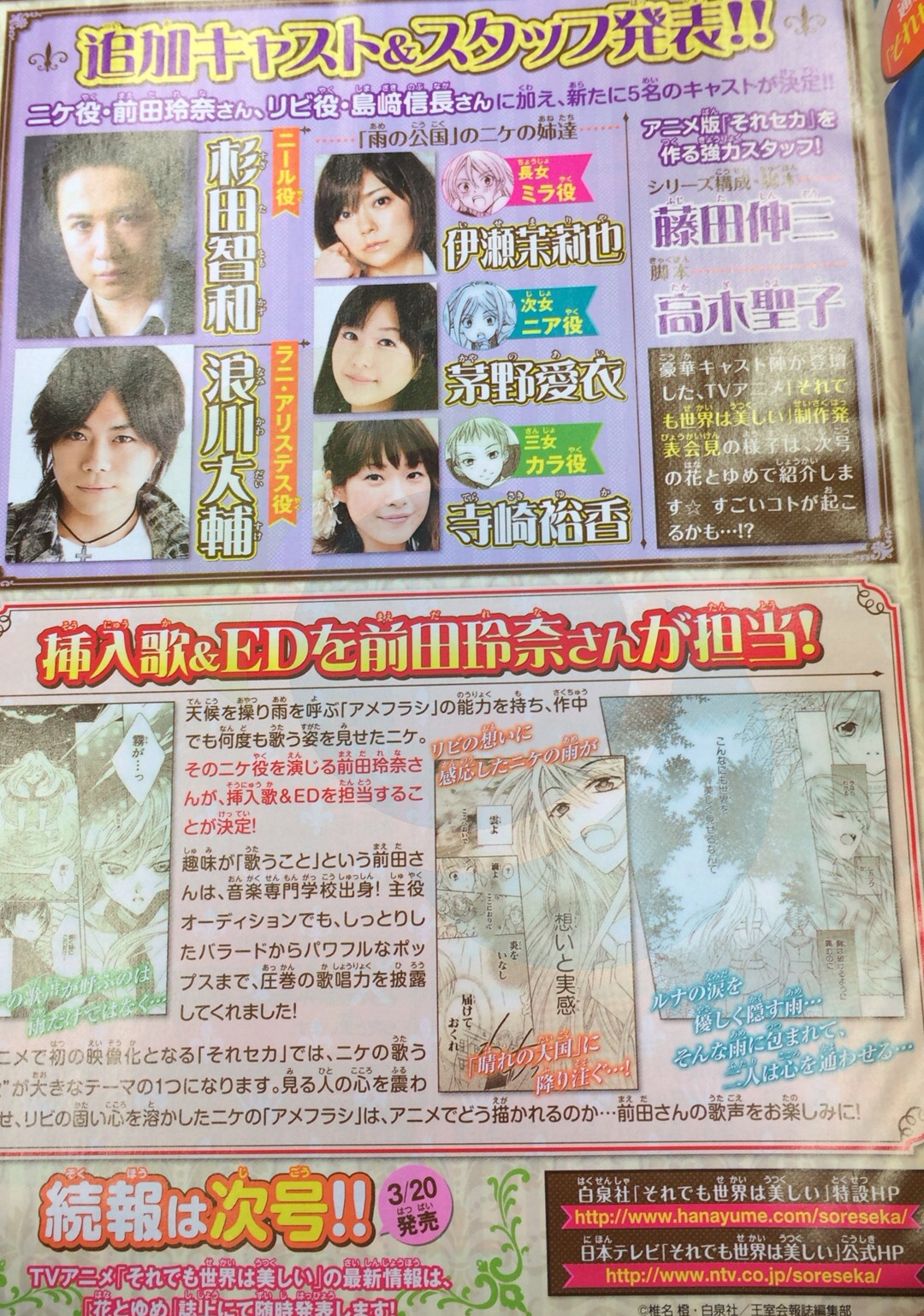 Il settimo numero di quest’anno della rivista Hana to Yume edita dalla Hakusensha che è uscita mercoledì di questa settimana, ha annunciate diversi membri del cast per l’adattamento animato di Soredemo Sekai wa Utsukushii (Anche così, il mondo è meraviglioso). I nomi dei doppiatori che presteranno le proprie voci ai protagonisti erano già stati comunicati, mentre, per quanto riguarda i personaggi secondari troveremo Daisuke Namikawa nei panni di Lani Aristes, Tomokazu Sugita in quelli di Neil, segretario di Livi, Mariya Ise in quelli di Mira, la sorella maggiore di Nike, Ai Kayano in quelli di Nia, la seconda sorella di Nike, e Yuka Terasaki in quelli di Kara, la terza sorella di Nike.