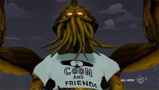 Cthulhu semina così panico e distruzione ma siccome il suo arrivo coincide con la cacciata di Cartman dal suo club di supereroi (perché ovviamente è un bastardo e punisce i suoi amici come Alex DeLarge in Arancia Meccanica puniva i suoi drughi), il mostro e il ciccione si riuniscono sotto il nuovo gruppo de “Procione ed i suoi amici” e massacrano hyppie, supermercati biologici e molti altri luoghi odiati da Cartman.