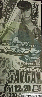 Il ventiquattresimo numero di quest’anno della rivista Young Gangan edita dalla Square Enix ha annunciato, venerdì di questa settimana, che dall’anime Space Dandy dello studio BONES sarà tratto un manga. La storia sarà sceneggiata da Masafumi Harada e illustrata da Sung-woo Park (Kurokami/Black God, Oracle of Secret Shrine Maiden) e Red Ice. Il primo capitolo del manga di Space Dandy, della lunghezza di sessanta pagine con una prima pagina a colori, farà il suo debutto sul prossimo numero della rivista, in vendita il 20 Dicembre.
