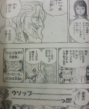 Usop: che c’è Robin, non ti stai lasciando sfuggire una grande chance proprio ora, ehi vecchio anch’io ho qualcosa da chiederti, lo One Piece, il tesoro che è la causa di tutto, è davvero sull’ultima isola