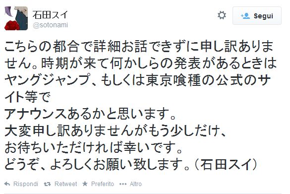 Quando la seconda serie d’animazione di Tokyo Ghoul è stata annunciata, si è pensato che il messaggio su Twitter dell’autore si riferisse a questo, ma probabilmente riguardava il suo nuovo manga.