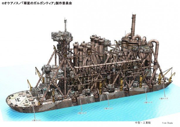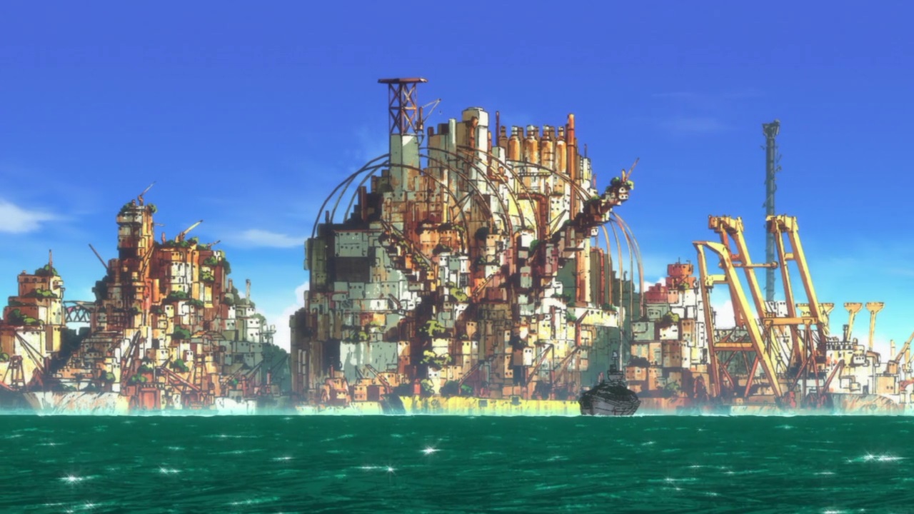 Suisei no Gargantia, come potrete a questo punto immaginare, non gode di una grande originalità: presenta temi ampiamente usati sia nell’animazione che nella letteratura di genere, il suo valore sta nella mano sapiente dello sceneggiatore che ha miscelato questi elementi. Per essere un prodotto senza troppe pretese, comunque, si dimostra ben realizzato, sia dal punto di vista delle animazioni, ma soprattutto per i bellissimi ambienti. Non dovendo disegnare un panorama troppo complesso (il mare sa essere monotono, si sa) hanno arricchito di tantissimi dettagli le navi, caratterizzate da colori rugginosi, ferrosi, e tantissimi drappeggi, tende, casse e oggetti che possono ingombrare il ponte di una nave…. non mancano le vedute da varie angolazioni di questi ambienti, sia perchè strutturati su vari livelli, sia perchè al posto di ascensori vengono usati “comodissimi” deltaplani. In definitiva, venti minuti a settimana usati bene.