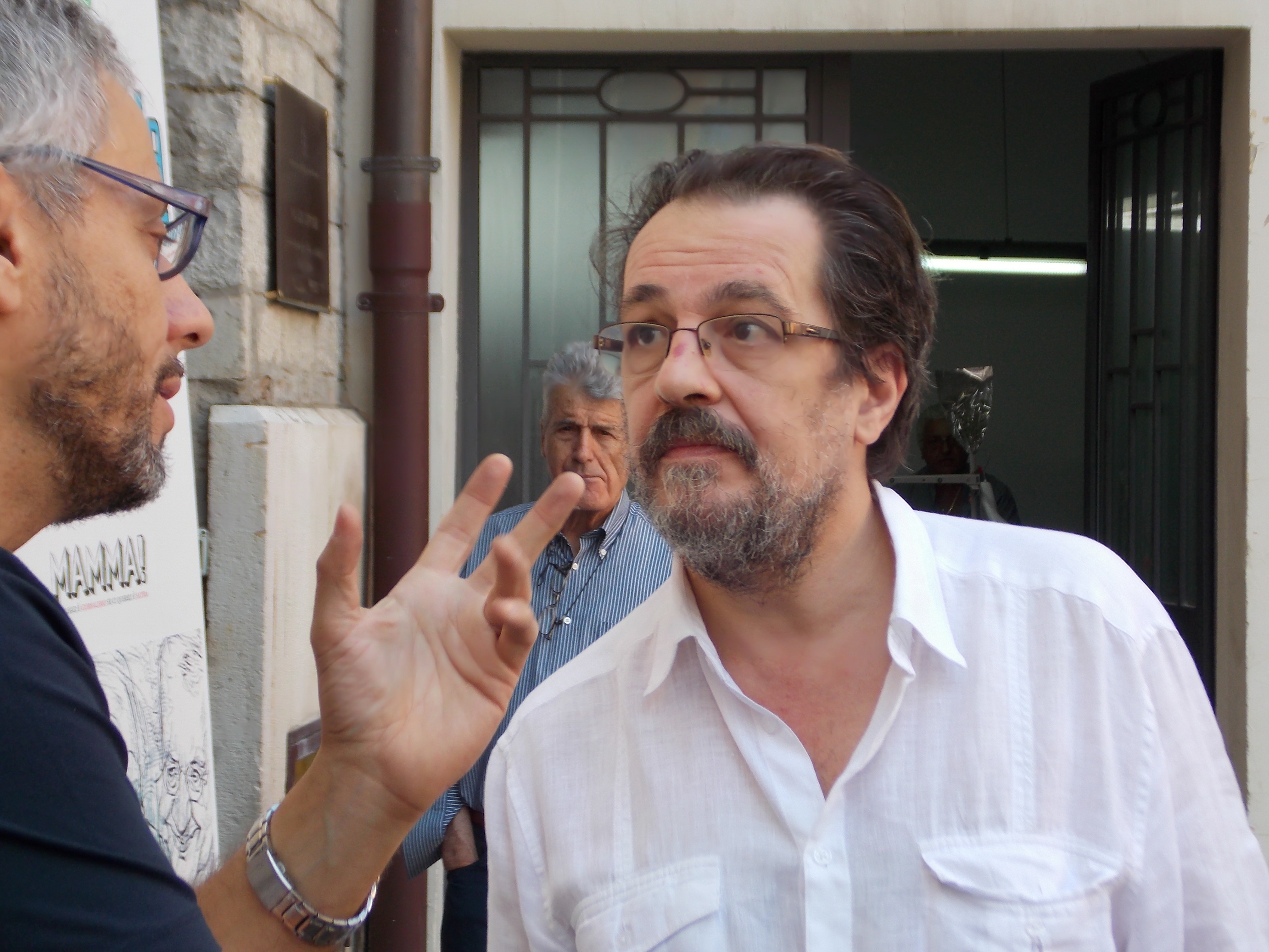 L’incontro con Riccardo Mannelli è avvenuto giovedì 22 agosto, nella città di Potenza, per merito di un evento organizzato da Giulio Laurenzi, proprietario della locale fumetteria (unica della Basilicata!) Comicstore che durante il corso dell’estate (e in quelle degli ultimi anni) ha visto susseguirsi una serie di eventi, dal corso di disegno all’incontro dei cosplayer, sino alla presentazione di opere del fumetto italiano e all’incontro con autori. La prima impressione avuta, stringendo la mano a Riccardo, è quella di avere davanti un “guerriero”: un soldato che ha dedicato la vita a battersi, attraverso le sue opere, nell’esercito della Cultura, rivestendo i ranghi di comandante nell’armata degli artisti. E lo è, Mannelli, un artista a tutto tondo: se lo definite “vignettista satirico” (come si può leggere sia in rete, sia su riviste e quotidiani) lui si schernisce, dicendo che nella sua vita non ha mai voluto fare né l’umorista, né il comico (categoria che, peraltro, poco sopporta), mentre ciò che lo ha sempre spinto, il motore che ha mosso, inesorabile, la sua produzione artistica è il semplice gusto di rappresentare, di mettere, nero su bianco, il flusso dei suoi pensieri su una pagina, così da far acquisire a questi ultimi una forma tangibile attraverso le linee dei suoi disegni.