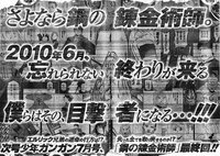 Per tutti gli appassionati di Full Metal Alchemist, ho due notizie: una bella e una brutta. Quale volete prima? La brutta? Ok. Dunque, mi spiace informarvi che ormai è deciso: il manga si concluderà nel numero di giugno della rivista su cui viene serializzato. Siamo paurosamente vicini alla conclusione. Per la precisione, manca solo un mese (nota: la rivista è la Shonen Gagan, mensile della square enix).In fondo vi ho messo l’immagine dell’annuncio.