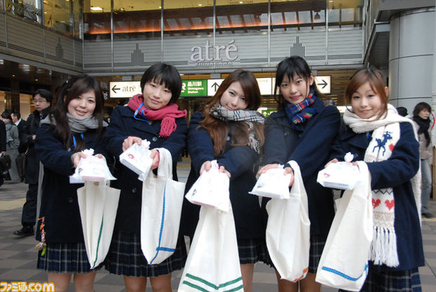 Ma venendo al sodo, ecco perchè questa notizia mi è piaciuta: la Konami, l’azienda produttrice di love plus, ha deciso, per celebrare il giorno degli innamorati, di unirsi i Pocky, i bastoncini ricoperti di cioccolato più famosi in Giappone, per creare un evento davvero particolare e tutto dedicato alle coppiette in amore. Ieri infatti Il sol levante è stato invaso da deliziose modelle vestite con la divisa scolastica che distribuivano scatole di pocky e trading cards di love plus a tutte le coppiette che passassero davanti alle maggiori stazioni del paese.