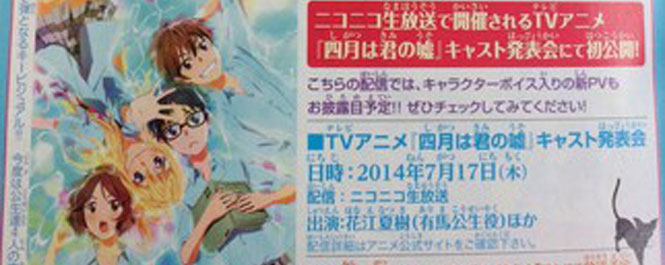 Domenica della scorsa settimana il sito web ufficiale dell’adattamento animato tratto dal manga Shigatsu wa Kimi no Uso di Naoshi Arakawa ha cominciato a diffondere