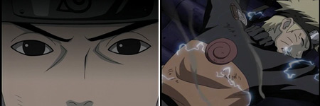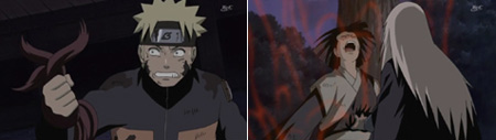 Riassunto. Mentre Asuma combatte contro Kazuma, gli altri tentano di fermare Sora che ormai ha perso il controllo e ha prodotto la quarta coda della Volpe. Naruto continua a chiamare Sora, convinto che questi sia ancora cosciente, ma appena lo tocca inizia a trasformarsi anche lui in Volpe. Kazuma spiega che finchè i due saranno vicini, il potere della Volpe continuerà ad aumentare fino a distruggere il villaggio. Naruto invece riesce a bloccare la trasformazione con la sua forza di volontà e incita Sora a fare altrettanto.