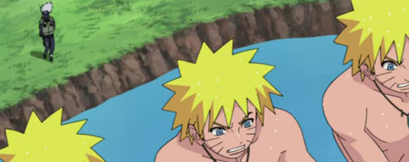 Riassunto. Hidan e Kakuzu portano con sè il cadavere di Chiriku per riscattare la taglia. Tsunade invia 20 gruppi alla loro ricerca per fermarli e Naruto continua ad allenarsi nel tagliare una cascata usando un gran numero di cloni giorno e notte sotto la sorveglianza di Kakashi e Yamato. Una notte, Sakura, seduta sul proprio letto a guardare la vecchia foto del team 7, pensa a Sasuke, a Naruto e alle parole di Yamato, versando infine una lacrima. Il giorno seguente Naruto riesce finalmente a tagliare la cascata, completando così la seconda fase dell’ addestramento.
