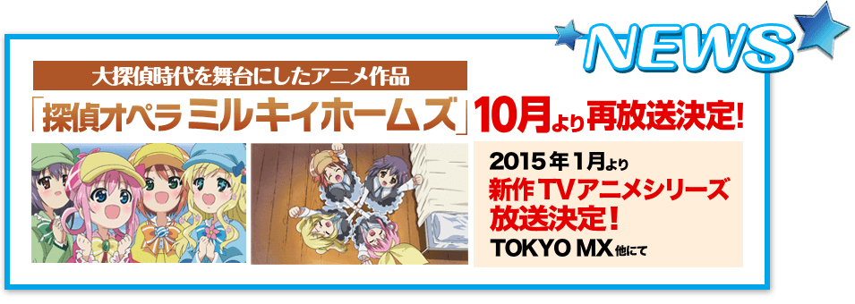 Dal franchise di Tantei Opera Milky Holmes sono già state tratte diverse serie televisive d’animazione, compresa quella dell’anno scorso intitolata Futari wa Milky Holmes, e le precedenti Tantei Opera Milky Holmes Summer Special, Tantei Opera Milky Holmes Dai-Ni-Maku, Tantei Opera Milky Holmes Alternative ONE -Kobayashi Opera to 5-mai no Kaiga-, e Tantei Opera Milky Holmes Alternative TWO -Kobayashi Opera to Kokū no Ōgarasu- . La prima serie, inoltre, comincerà a essere trasmessa in televisione a partire da Ottobre per pubblicizzare l’inizio della nuova serie.