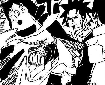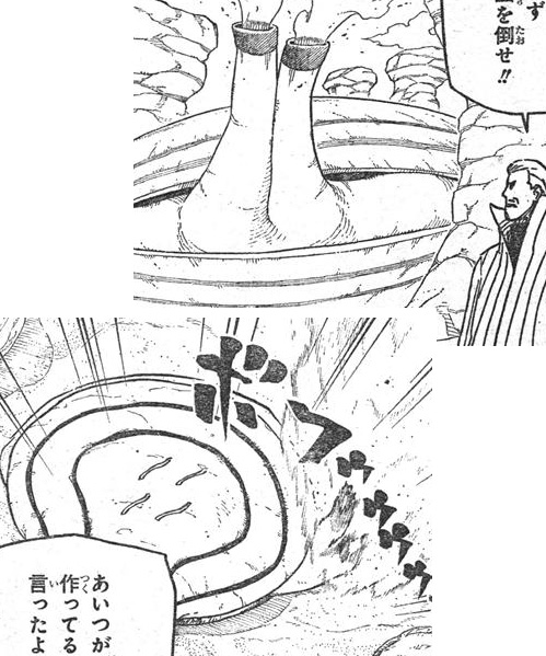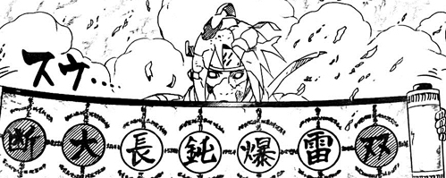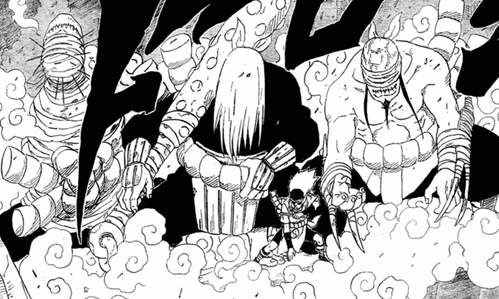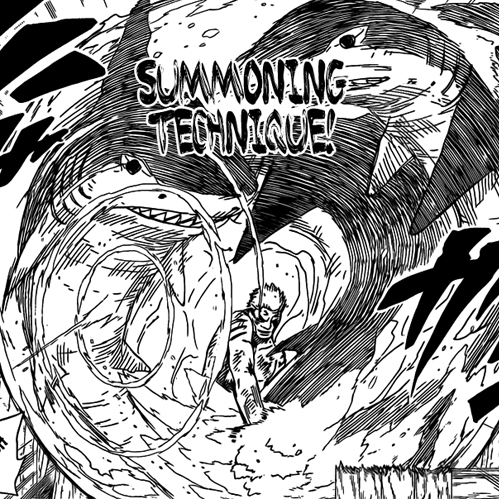Armi: già Ten Ten, durante l’esame di selezione dei Chuunin, aveva mostrato come fosse possibile richiamare oggetti inanimati, che siano armi o rifornimenti, lo qualsiasi altra cosa. Anche Sasuke ha usato il richiamo in questo modo, apponendo dei sigilli alle sue polsiere. Resta ancora da spiegare se è una normale Kuchiyose (ed in tal caso, il patto di sangue non esiste?) oppure qualcos’altro. Mangetsu Hozuki utilizza probabilmente una tecnica simile per evocare quattro delle sette leggendarie spade della nebbia, e vediamo comparire anche la “Tagliateste” di Zabuza, poco prima. Come si è materializzata la mannaia del demone? Le armi, per essere evocabili, devono trovarsi in un luogo apposito o devono semplicemente essere “marcate”?
