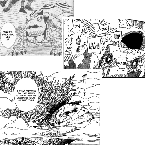 Tartarughe: Gai è l’unico a mostrare di saperne evocare una, di nome Ninkame. Non ha mostrato alcuna abilità ninja fin’ora ed ha una taglia “normale”, a differenza di molte altre evocazioni. Scopriamo poi che esistono almeno altre due tartarughe entrambe gigantesche, ovvero la tartaruga isola di Kumogakure e la sua prole. La prima, all’interno del suo guscio, possiede una stanza in cui è possibile concentrarsi notevolmente, entrando nel proprio subconscio; questa è accessibile dalla cosiddetta cascata della verità, un luogo in cui si può affrontare il proprio io interiore. Queste due tartarughe sono solo delle custodi dei Jinchuuriki di Kumogakure (all’interno vediamo statue solo del Nibi e dell’Hachibi), oppure delle evocazioni utilizzabili in battaglia?
