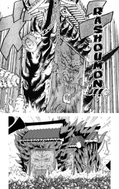 Rashomon: è la porta infernale evocata da Sakon&Ukon ed Orochimaru, la sua caratteristica è quella di riuscire a respingere attacchi frontali anche molto potenti, la Tripla Rashomon di Orochimaru non riesce però a resistere alla Teriosfera di Naruto a quattro code. Nonostante sia probabilmente un oggetto inanimato, è comunque possibile che sia un essere intelligente (come Samehada), visto anche il volto umanoide che reca sulla parte frontale. Escludendo che esista un regno dei portoni, in questo caso possiamo chiederci se l’agettivo “infernale” sia un epiteto o un toponimo, ed in questo secondo caso su cosa sia e dove si trovi questo “Inferno” (potrebbe semplicemente essere un’isola, un tempio, non per forza la dimora dei morti).