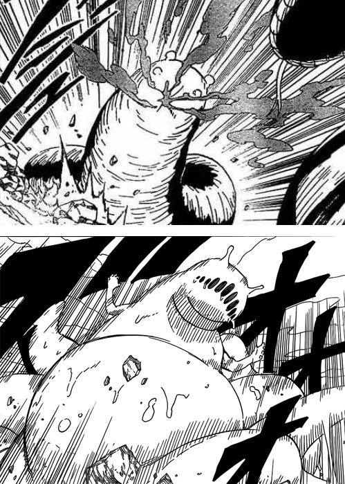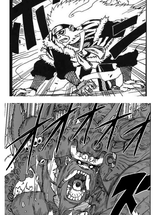 Scimmie: l’unica evocazione nota è Enma. Egli è il signore delle scimmie, oltre ad essere un maestro di taijutsu, è in grado di trasformarsi in un bastone di ferro durissimo (combinando forse la “tecnica della trasformazione” e un’abilità elementale?) e di estrarre da esso parti del suo corpo. Recentemente però abbiamo scoperto che Son Goku, il Tetracoda, definisce sè stesso come “Re dei Primati”, è possibile che esista un regno di queste creature, e che un tempo esso fosse presieduto dallo Yonbi? Alla sua prima cattura (durante le grandi guerre per il potere), Enma potrebbe aver preso il suo posto? Sappiamo comunque che è possibile avocare un Biju, vediamo Tobi farlo in passato e Madara provarci ora, quindi possiamo supporre che sia possibile anche per gli altri?