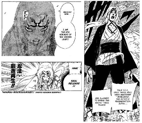 L’utilizzatore, usando come traccia il DNA della persona che vuole evocare, richiama dall’aldilà (mondo puro) l’anima dell’evocato confinandola in un corpo umano vivo, nel mondo Impuro appunto. Tutto ciò mi fa venire in mente di nuovo il discorso di Tobi: tramite il chakra Yang si richiama alla vita l’anima utilizzando una versione particolare del richiamo, tramite il chakra Yin si trasforma il corpo sacrificale in quello dell’evocato e la tecnica è compiuta. Il Jutsu è stato proibito probabilmente per problemi etici nonché per potenziali conflitti tra paesi, c’è però un dubbio sulla sua invenzione: sappiamo che è stata scoperta e perfezionata da Tobirama Senju, perché l’ha creata? Per utilizzarla in battaglia o per entrare in contatto con grandi personalità del passato ormai inaccessibili? Il sacrificio umano era necessario anche allora (il che getterebbe un ombra molto oscura sul suo personaggio) oppure esso è diventato parte solo della versione di Orochimaru?