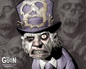 The Goon compare per la prima volta più di dieci anni fa, era il 1999 quando il suo ideatore, Eric Powell, inizia a pubblicare la serie. Da allora sono passati più di dieci anni eppure The Goon è rimasto un prodotto unico nel suo stile. Pubblicato dalla Dark Horse (la stessa casa editrice di Hellboy) in America, qui in Italia trova inizialmente fortuna edito da Magic Press, e recentemente viene rilanciato da Panini Comics che, a marzo del 2012, rilascia 3 diversi volumi della serie: 1 – Il giorno dell’avvoltoio, 2 – La mia infanzia criminale (e altri racconti pesi), 3 – Cumuli di macerie; i prezzi si aggirano intorno ai 14 euro l’uno, eccezion fatta per il superpack che contiene tutti e tre gli albi ma ad un prezzo minore 36 euro (invece che i 41 euro dei 3 volumi comprati separatamente… ma basta parlare di prezzi).