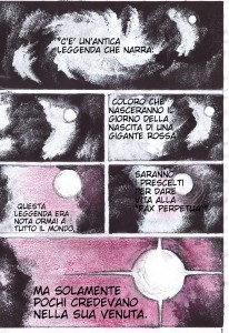 Menzione particolare sulla tematica della gigante rossa: apprendiamo che coloro che nascono nel momento in cui una stella raggiunge quello stato sono destinati a cambiare il mondo, e portare la “pax perpetua“… che nascessero 5 persone durante un evento del genere era un fatto meramente statistico. Ho apprezzato tantissimo questo concetto, e anche lo stile per colorare la tavola introduttiva che racconta proprio questa leggenda.