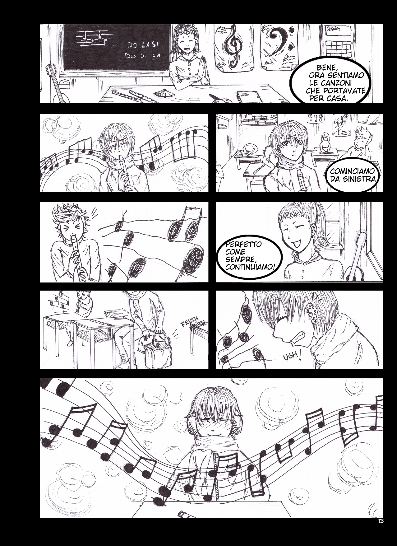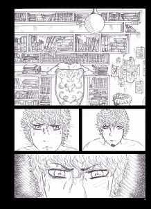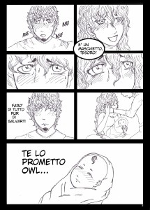 È stato mantenuto lo stile e il ritmo della narrazione presentato nel primo capitolo: fatto di scene molto statiche, di poche parole e di sguardi, che vogliono proprio comunicare gli stati d’animo senza vincolarsi eccessivamente all’uso del linguaggio. In alcune tavole questo obiettivo è raggiunto come nella tavola 3 per esempio, la nascita di Owl, o la 6 che ci mostra l’isolamento patito dal protagonista per la sua diversità, però in certi momenti le vignette appaiono vuote, causa l’assenza anche della minima presenza di sfondo. Diversamente accade nelle tavole 4 e 5, nella prima gli interni e la biblioteca del padre di Owl vengono mostrati per dare una chiara idea di un lavoro che sta portando avanti a fatica. Gli esterni vengono sempre disegnati: da questo ho ritenuto che lasciare bianchi gli sfondi di alcune vignette in interno sia stata una scelta stilistica, ma è solo una mia opinione… Lo stile di disegno è molto chiaro, al primo impatto da un effetto diverso da quello che è lo stile tipico di questo genere di storie, con temi sempre molto scuri; ci sarebbe, comunque, da migliorare in alcuni dettagli del disegno (come le mani) e con l’inchiostratura, ma si tratta di competenze che si acquisiscono col tempo e l’esercizio.