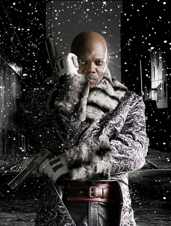 Questa è una delle cose più divertenti del film. Vi dico una cosa: per Sam Jackson avevamo creato tre pistole, una più grande dell’altra. A quel punto Sam mi chiedeva: “dov’è quella ancora più grande?!”. Avevo quindici minuti e mi ha chiesto: “dammi la più grande che abbiamo”. Ho cominciato a giocare con le pistole… mi sentivo come la scimmia di 2001 di Kubrick perché mettevo insieme velocemente una pistola sull’altra e poi un’altra e un’altra ancora, proprio come le ossa all’inizio di quel film. Ho detto agli attrezzisti di legarle tutte insieme. Praticamente quando è arrivato… Sam Jackson era come un robot di Transformers!