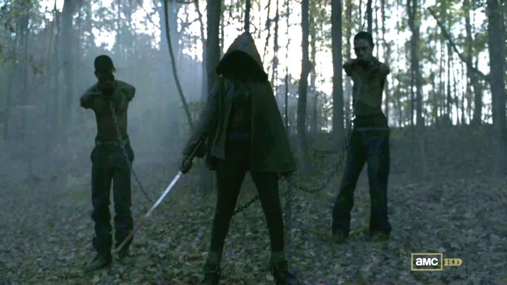 Il gruppo si ritrova “sfrattato” dalla fattoria e con un personaggio in meno disperso chissà dove se non morto, ma Andrea non pare ancora morta, infatti viene salvata nella foresta da una figura incappucciata armata di katana con due zombie a guinzaglio senza braccia ne mascella.