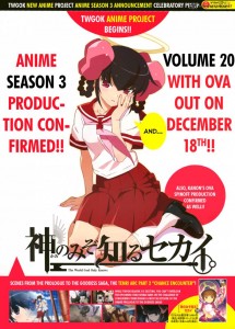 Mercoledì è stato annunciato sulla doppia edizione della rivista Weekly Shonen Sunday della Shogakukan che verrà prodotta la terza serie animata tratta dal manga The World God Only Knows e non solo: infatti mentre i fan aspettano ancora la seconda parte dell’OAV Tenri-hen, è stato annunciata la produzione di un altro OAV spin-off che vedrà come protagonista Nakagawa Kanon, la idol che compare nel manga disegnato e sceneggiato da Tamiki Wakaki.