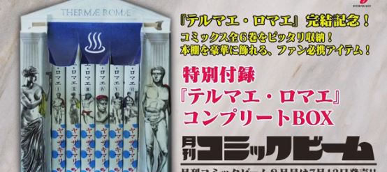 Per festeggiare la pubblicazione dell’ultimo volumetto del manga, inoltre, il prossimo numero di Monthly Comic Beam della Enterbrain, in vendita il 12 Luglio, includerà in allegato la collezione completa dell’intera serie di Thermae Romae.
