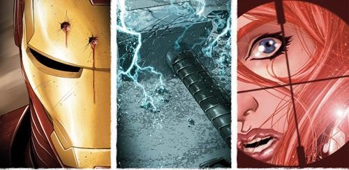 La Marvel, uno dopo l’altro, ci ha concesso, attraverso i disegni di Marco Checchetto, di osservare le fiamme divampare attorno al braccio di Wolverine (senza però mostrarci altri particolari dell’artigliato canadese), Mjolnir abbandonato a se stesso, lo scudo di Capitan America insanguinato e conficcato nel terreno, la maschera di Tony Stark segnata da fori di proiettili e insanguinata, il volto di Vedova nera attraverso un mirino e l’uomo ragno inerme con un mitra puntato al petto. Tutte queste immagini hanno un solo punto in comune, la scritta: “This Is War” (questa è guerra).