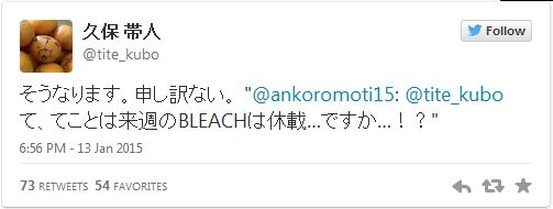 L’autore di manga Tite Kubo ha confermato col suo account di Twitter che il nuovo capitolo di Bleach non uscirà sul prossimo numero della rivista Weekly Shonen Jump edita dalla Shueisha, che sarà messo in vendita in Giappone lunedì della prossima settimana.