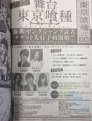 Lo spettacolo di Tokyo Ghoul sarà portato in scena presso il AiiA 2.5 Theater a Tokyo tra il 2 e l’8 luglio di quest’anno e presso il Kyōto Gekijō di Kyoto dal 18 al 20 luglio.