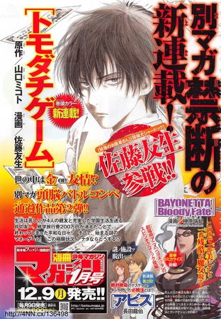 Sabato della scorsa settimana, il numero di dicembre della rivista Bessatsu Shōnen Magazine edita dalla Kodansha ha dato l’annuncio che l’artista Yuki Sato lancerà un nuovo manga intitolato Tomodachi Game sul prossimo numero della rivista stessa in vendita il 9 Dicembre. Mikoto Yamaguchi (Shinigami-sama ni Saigo no Onegai o, Scumbag Loser) lavorerà alla sceneggiatura originale della serie. Il manga, che descriverà una serie di battaglie di intelligenza tra i personaggi, si aprirà con alcune pagine a colori.