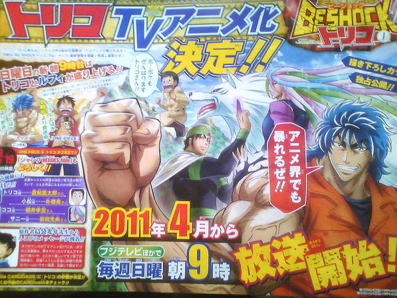 Vi avevo già parlato di una novità animata per la primavera 2011, ma a quanto pare le sorprese non erano ancora finite: dopo una lunga attesa arriva finalmente l’anime di Toriko, una delle serie più recenti del Weekly Shonen Jump che insieme a titoli quali Nurarihyon no Mago o anche Beelzebub cerca di farsi spazio all’ombra dei big della rivista come One Piece e Naruto.