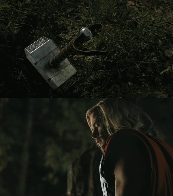 Queste immagini ci mostrano le tipiche espressioni crucciate del figlio di Odino, tanto per cambiare si tratta del suo martello, Mjolnir (simpaticamente rinominato “miommì” da un gruppo di allegri spettatori alla prima di Thor in Italia lo scorso anno… il gruppo comprendeva me) : cosa sarà accaduto e perché non lo impugna?