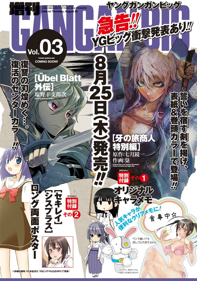 Young Gangan Big nasce come una rivista spinoff tratta dal più famoso magazine Young Gangan, che si è occupato della serializzazione della serie principale di Übel Blatt fin dal 2004. Inoltre, il prossimo numero di Young Gangan Big conterrà nelle sue pagine un’altra storia alternativa intitolata Kiba no Tabishonin Tokubetsu-hen, tratta dal manga Kiba no Tabishōnin ~The Arms Peddler~ creato dall’autore di Project ARMS, Kyoichi Nanatsuki, con le illustrazioni dell’artista Night Owl, che tra l’altro realizzerà la copertina del prossimo numero del magazine.