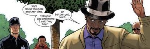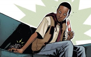 Bendis si concentra molto sulla figura di Miles, presentandocelo: veniamo così a conoscenza della sua situazione familiare(genitori entrambi vivi,questa volta) ed economica(estrazione povera, ha vinto alla lotteria del quartiere un posto in una scuola superiore esclusiva). Qui ammetto che si è un pò esagerato con lo strizzare l’occhio alle minoranze (il protagonista nero/ispanico ed il suo amico asiatico e obeso…), ma fortunatamente questo tipo di caratterizzazione rimane in secondo piano, poco più che un contorno.
