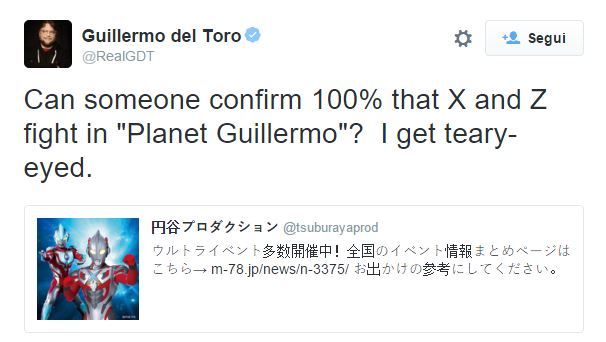 Le compagnia di produzione giapponesi non hanno mancato di notare l’amore del regista per la loro cultura popolare. In particolare, la casa produttrice di tokusatsu Tsuburaya. L’ultimo capitolo del loro franchise, Ultraman X al momento sta andando in onda in Giappone e Crunchyroll lo sta diffondendo in streaming. Guillermo del Toro, fan della serie da tanti anni, ha notato che nel quinto episodio di Ultraman X fa la sua comparsa un pianeta del nome… sospetto. La Tsuburaya Productions ha risposto, in inglese, che i sospetti del regista erano esatti. Ultraman X e Zero infatti, visitano, nel corso del quinto episodio, il pianeta Guillermo. Precedentemente del Toro aveva confessato il suo amore per il franchise in un’intervista giapponese qualche anno fa.